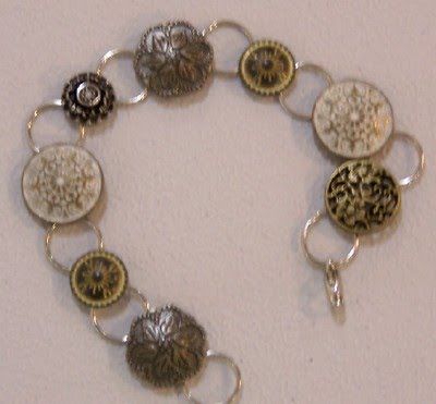 The bracelet above and below is made with out new Antique Brads. I got this idea from Arlena Craven. She had one at our last big event and I thought it was so beautiful that I had to run to Lansing and get the jump rings so that I could make one for me. My camera doesn't do real well with close ups but I think you can get the idea. Just open the brads up and attach the jump ring and then bend the prongs of the brad down. I put a little Crystal Effects on the back of each brad to hold it in place and I used a lobster claw clasp to hook the bracelet.